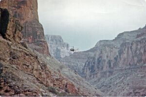 The MARBLE held up by block and tackle at Lava Falls during a 98,500 cfs flood September 19, 1923. Courtesy USGS